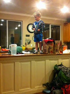 This made for a stressful few weeks. We had to put John in safe places or make sure Shyla was tethered to our back door or our banister. Otherwise, there was a lot of blood-curdling screaming going on and my heart alternated between breaking and flip-flopping numerous times a day. For those in a similar situation, who might be wondering how long it takes a five year-old to quit an irrational fear, it was one month. I knew when enough days went by with no vicious attacks, John would start to grasp that he was safe and could be friends with Shyla. Don't think I'm cruel to introduce such a fear right into the home - John begged to have this dog, and he showed signs of affection toward her right away - as long as she was asleep and securely tied to something.